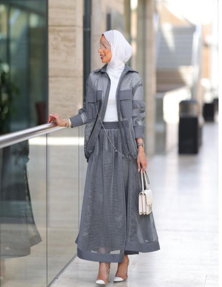 إطلالة عصرية وفريدة من نوعها! تألقي بجمال الأناقة الحديثة مع هذه المجموعة المذهلة. طقم من قطعتين باللون الرمادي العصري، يتميز بتصميم فريد من قماش شبكي (Mesh) يمنحه لمسة من الجاذبية والتميز. تتكون المجموعة من جاكيت قصير وتنورة واسعة طويلة، مما يمنحك إطلالة متكاملة تجمع بين الراحة والجمال. يمكن تنسيقها مع بلوزة داخلية بيضاء بسيطة وحقيبة يد صغيرة لمظهر متناسق ومتقن. هذا الطقم هو الخيار الأمثل لمن تبحث عن التجديد في إطلالاتها اليومية أو في المناسبات الخاصة.