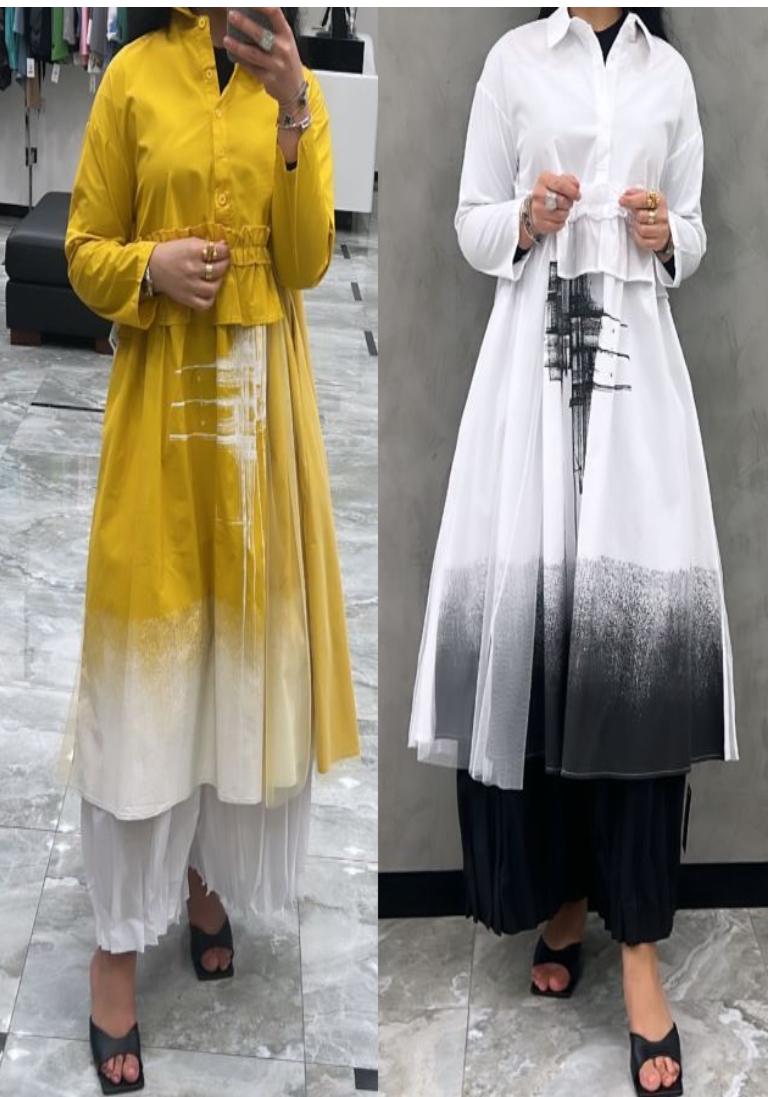 قطعة فنية تعبر عن شخصيتك! أضيفي لمسة من الأناقة العصرية إلى إطلالتك مع هذا القميص الطويل ذي التصميم الفريد. يتميز بقصة واسعة مع كشكشة جذابة عند الخصر وتصميم فني على الجزء السفلي يشبه البقع أو ضربات الفرشاة المتدرجة. متاح بلونين لتختاري ما يناسب ذوقك: الأصفر المشرق: يتدرج من الأصفر الحيوي إلى الأبيض النقي، ليمنحك إطلالة مشرقة وحيوية. الأبيض والأسود الكلاسيكي: يتدرج من الأبيض الناصع إلى الأسود الأنيق، لإطلالة عصرية لا تُنسى. يمكنك تنسيق هذا القميص بسهولة فوق بنطلون واسع لإطلالة يومية مميزة أو لمناسبة خاصة.