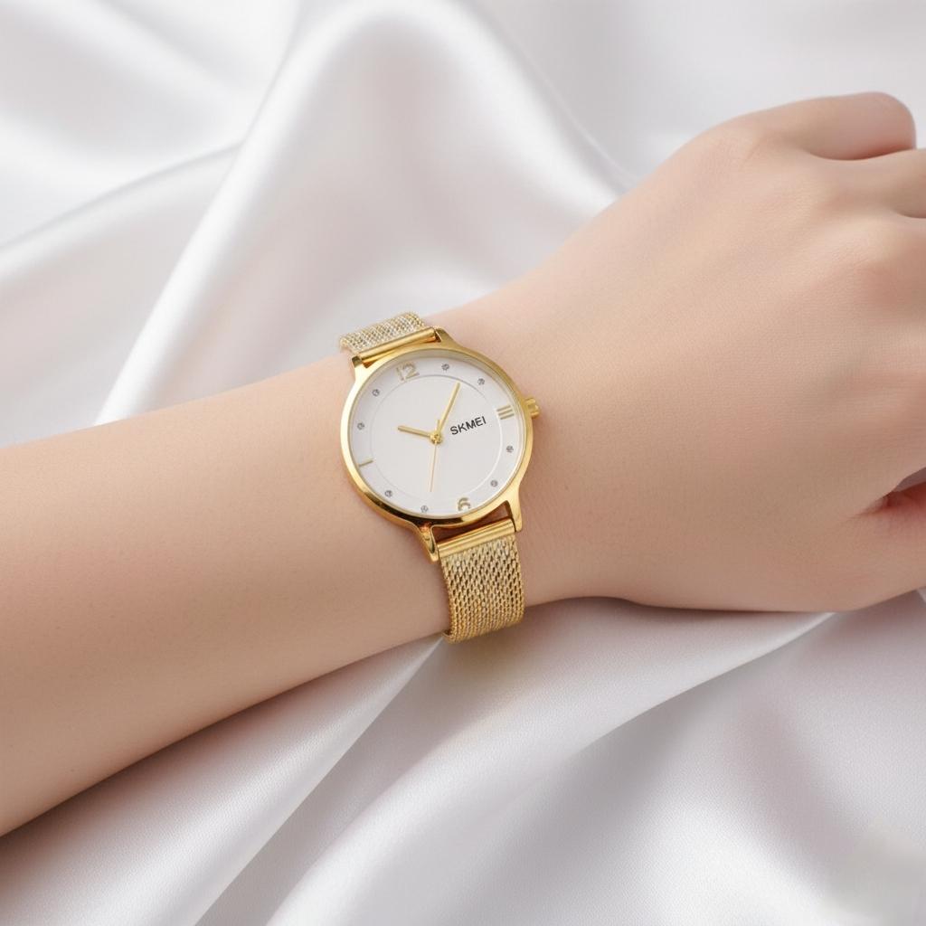 اجمعي بين الكلاسيكية العصرية واللمسة الفاخرة مع هذه الساعة النسائية الأنيقة. تتميز هذه الساعة بهيكل دائري كلاسيكي وسوار شبكي (Milanese Mesh) يضفي عليها مظهراً فاخراً وخفيف الوزن، مما يجعلها مثالية للارتداء اليومي أو للمناسبات.