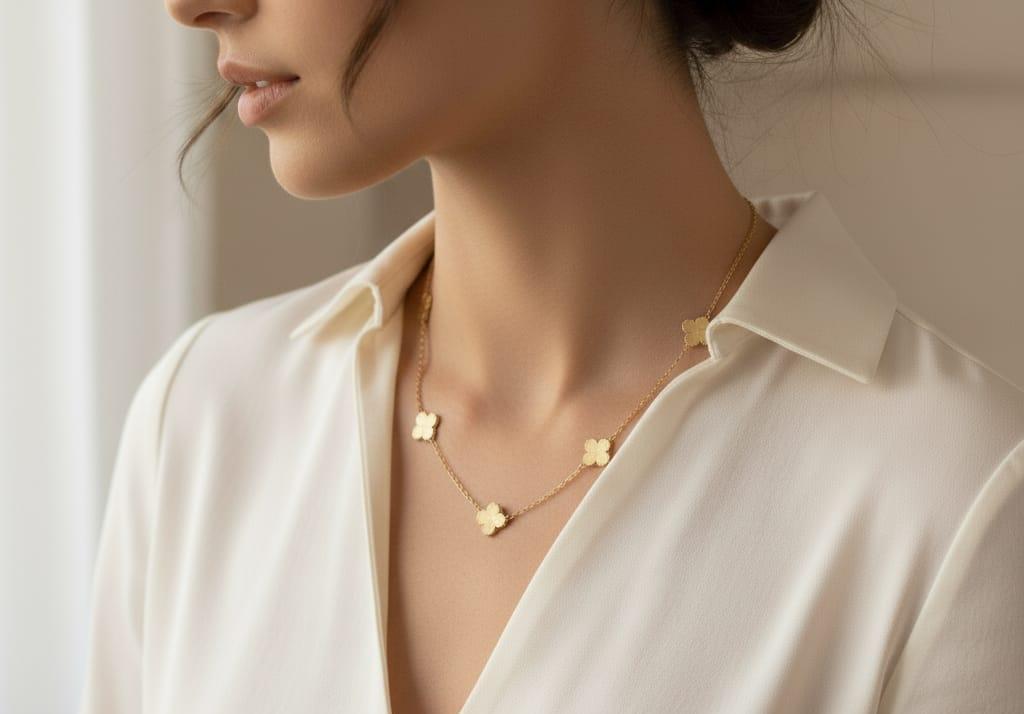الخامة: قلاده فان كليف من الستيل و الفولاذ المقاوم للصدأ مطلي بالذهب عيار 18